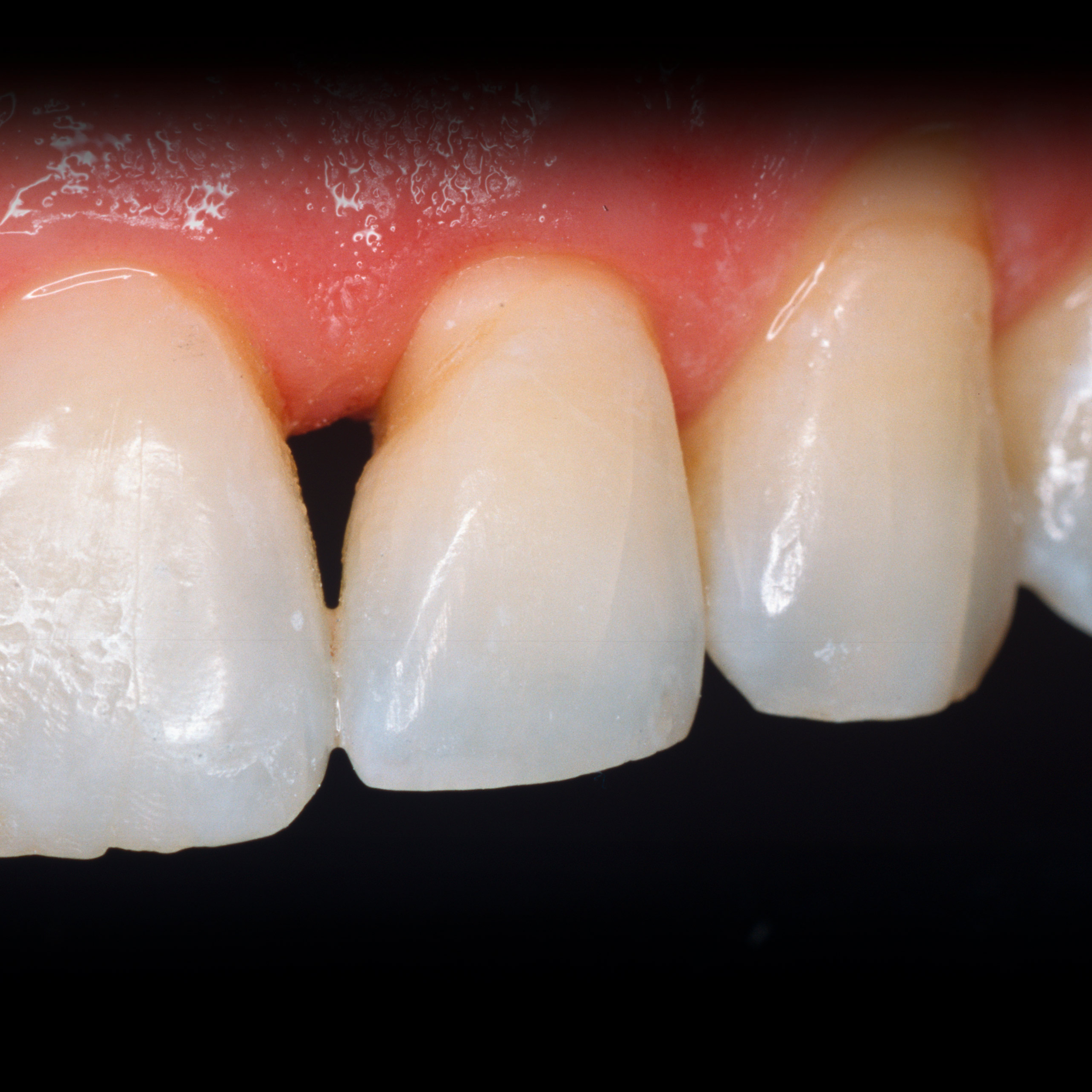 • Innerlich verfärbter seitlicher Schneidezahn nach Wurzelkanalbehandlung.