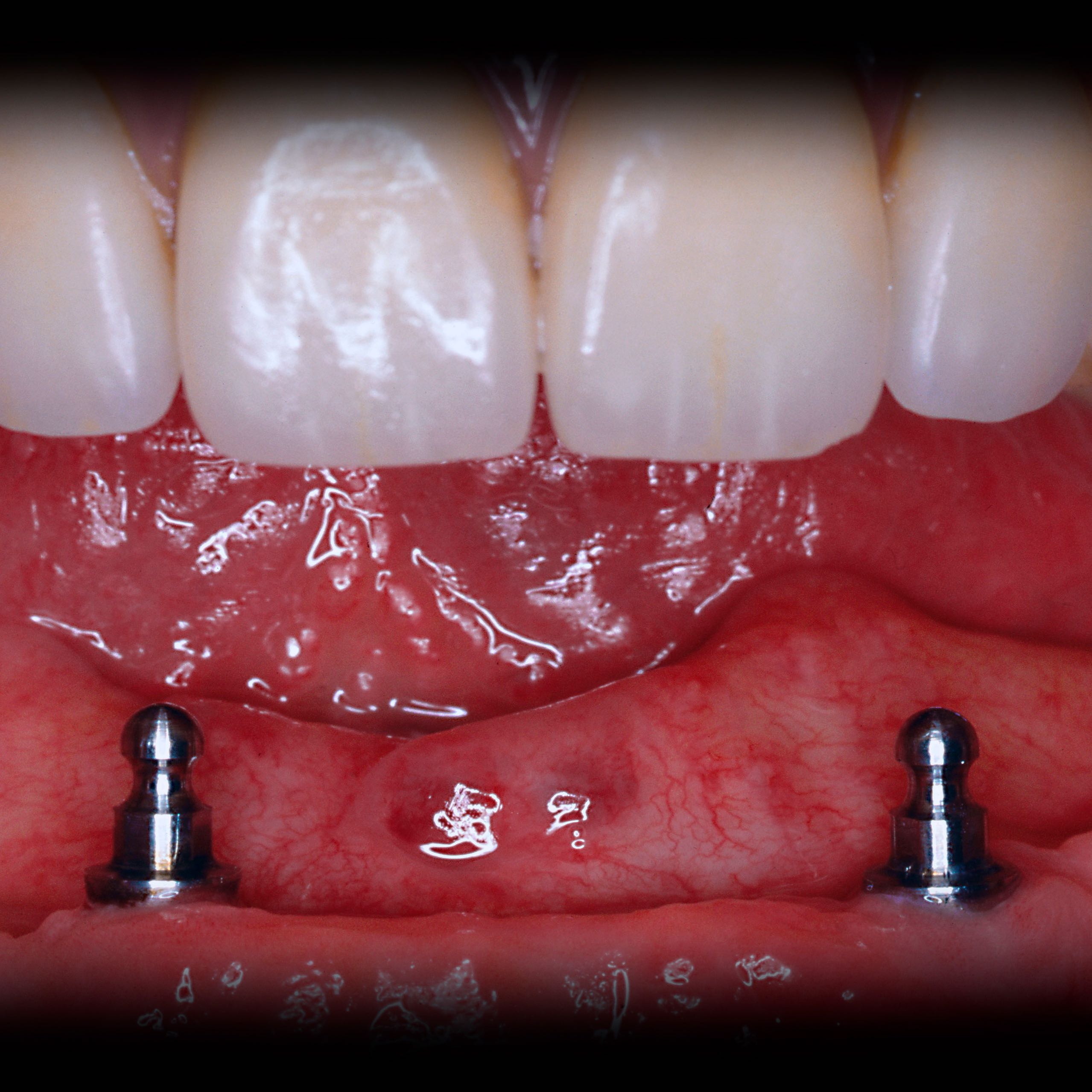 Freilegung, Aufbauplatzierung sowie direktes Einarbeiten der Implantat-Verbindungselemente in die vorhandene Prothese.