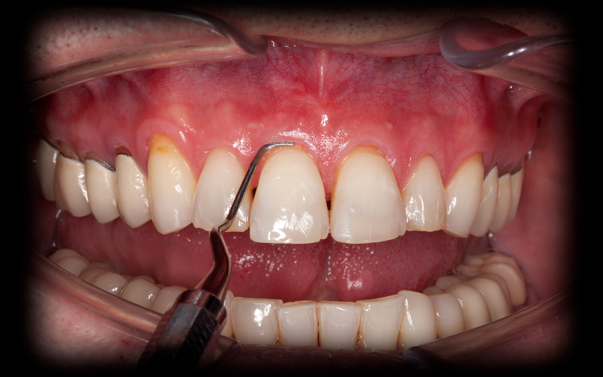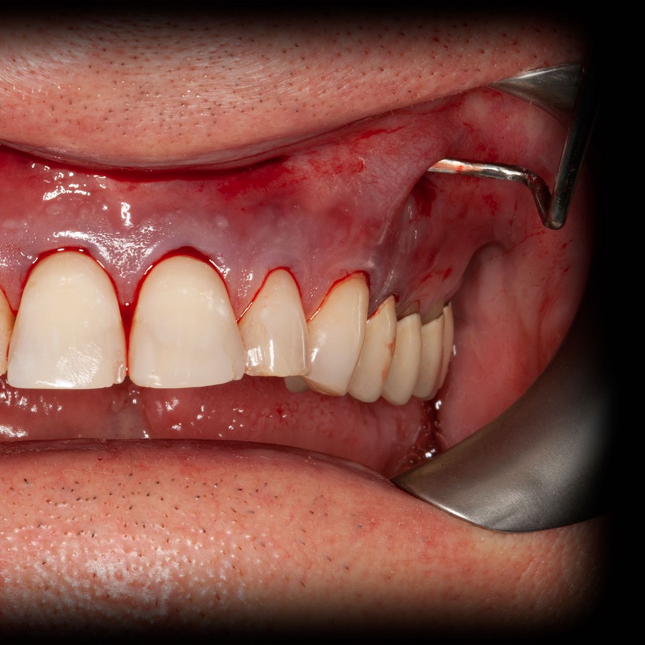 Rezessionen liegen bei ca. 25 Prozent der Patienten ab 40 Jahren vor. Mehrere Rezessionen in einer Behandlung zu decken bedeutet immer einen erhöhten Aufwand und eine umfassende Planung. Moderne Materialien ersparen uns in bestimmten Fällen die Gewebeentnahme aus dem Gaumen. Die Rezessionsdeckungen nach Art der „Pinhole Technique“ ist ein dieser Techniken. Der Gewebeersatz erfolgt mit Kollagenstreifen. Der Erfolg hängt von den anatomischen Voraussetzungen und dem Ausmaß der Rezession ab. Die Erfolgsrate bei diesen mikrochirurgischen Behandlungen liegt bei 85-100 Prozent. Die vollständige Heilung bedarf einige Wochen.