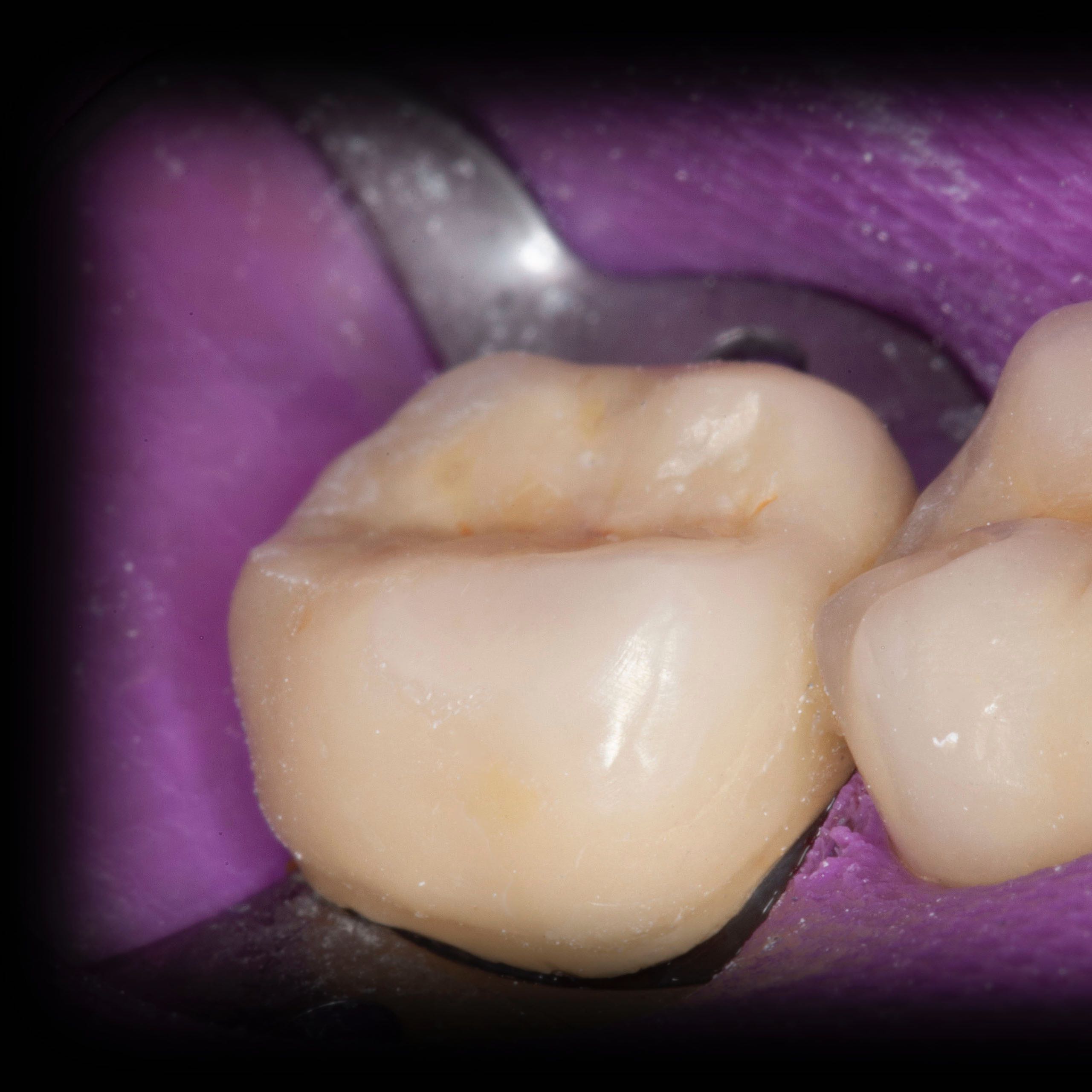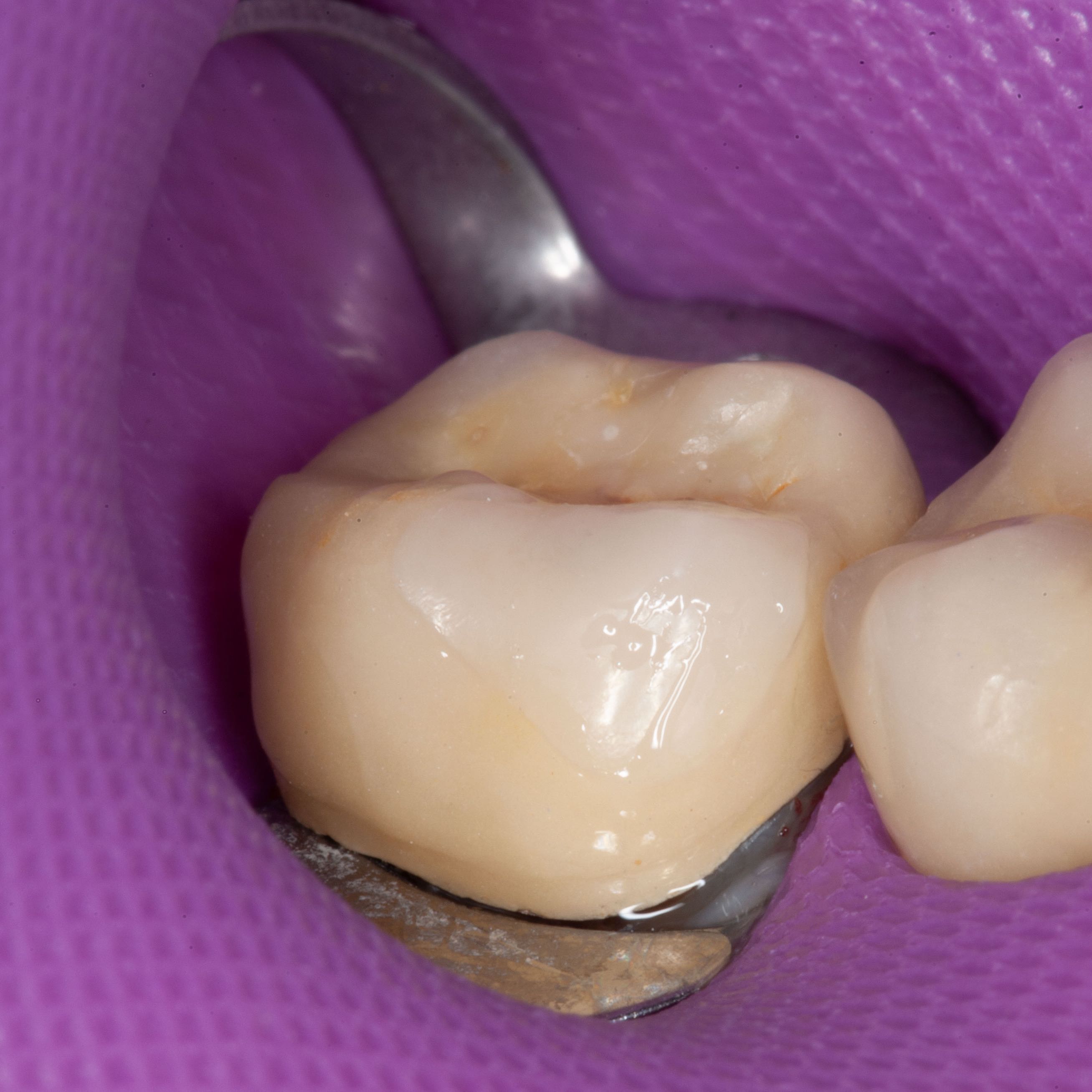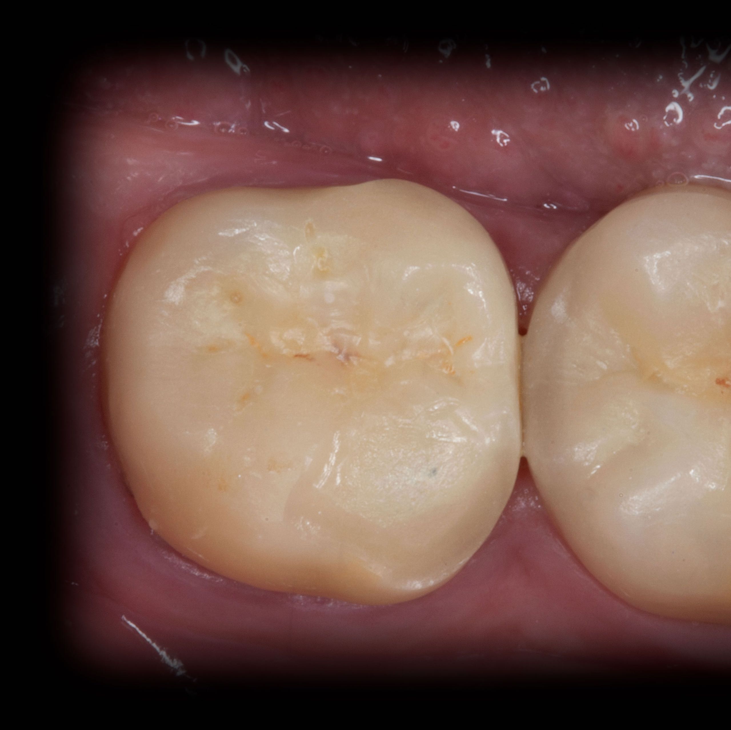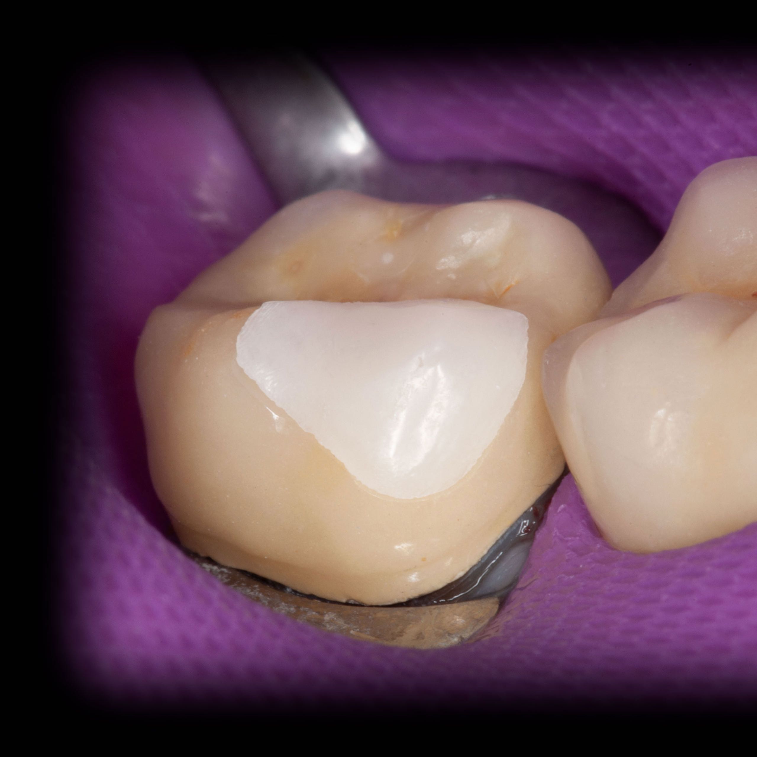 Bei solchen Keramikfrakturen muss immer erst nach der Ursache geforscht werden, damit sie nach der Reparatur lange halten. In diesem Fall war die Eckzahnführung zu schwach. Die Belastung der Krone in Folge zu hoch. Nach Anpassung der Führung konnte das Veneer sicher und stabil platziert werden