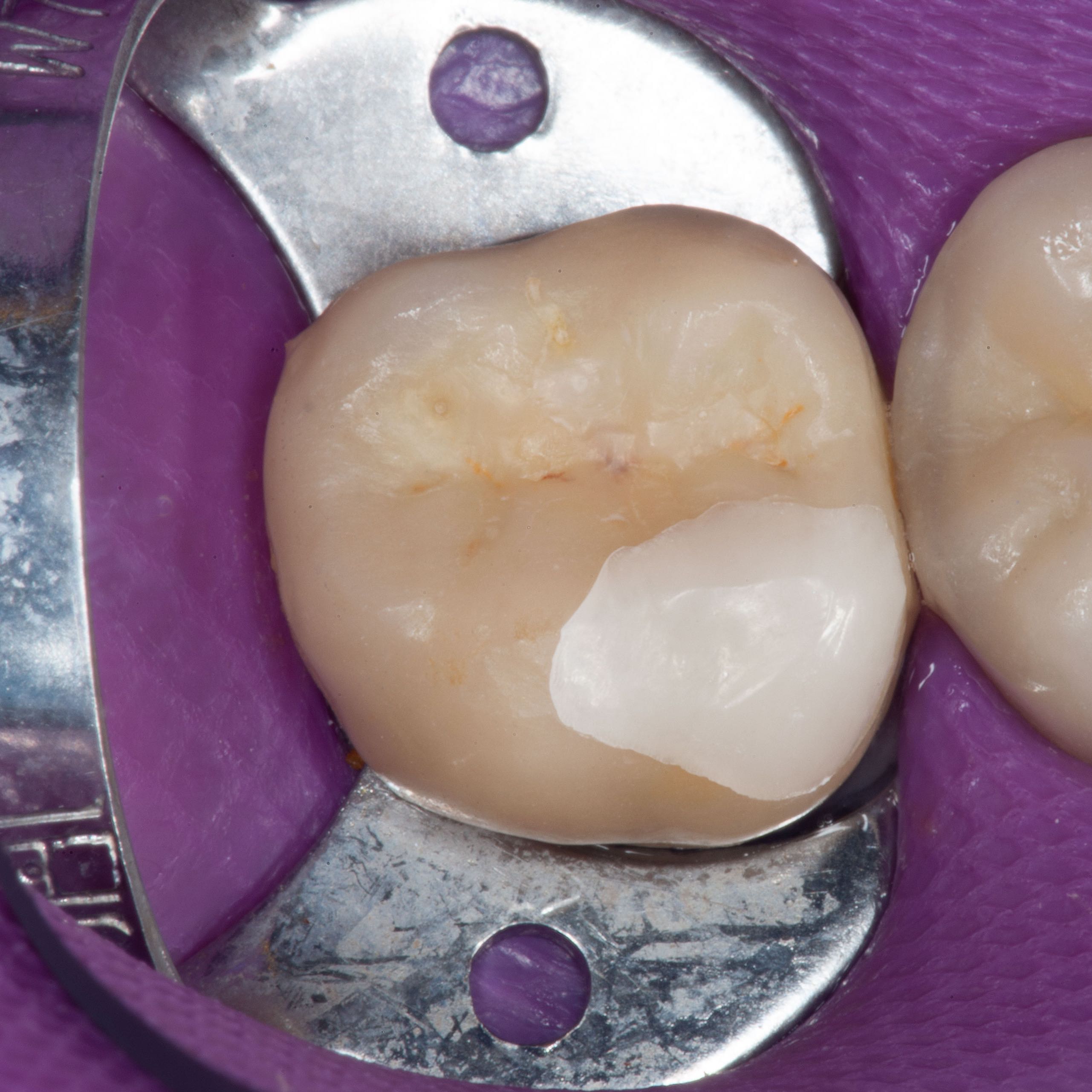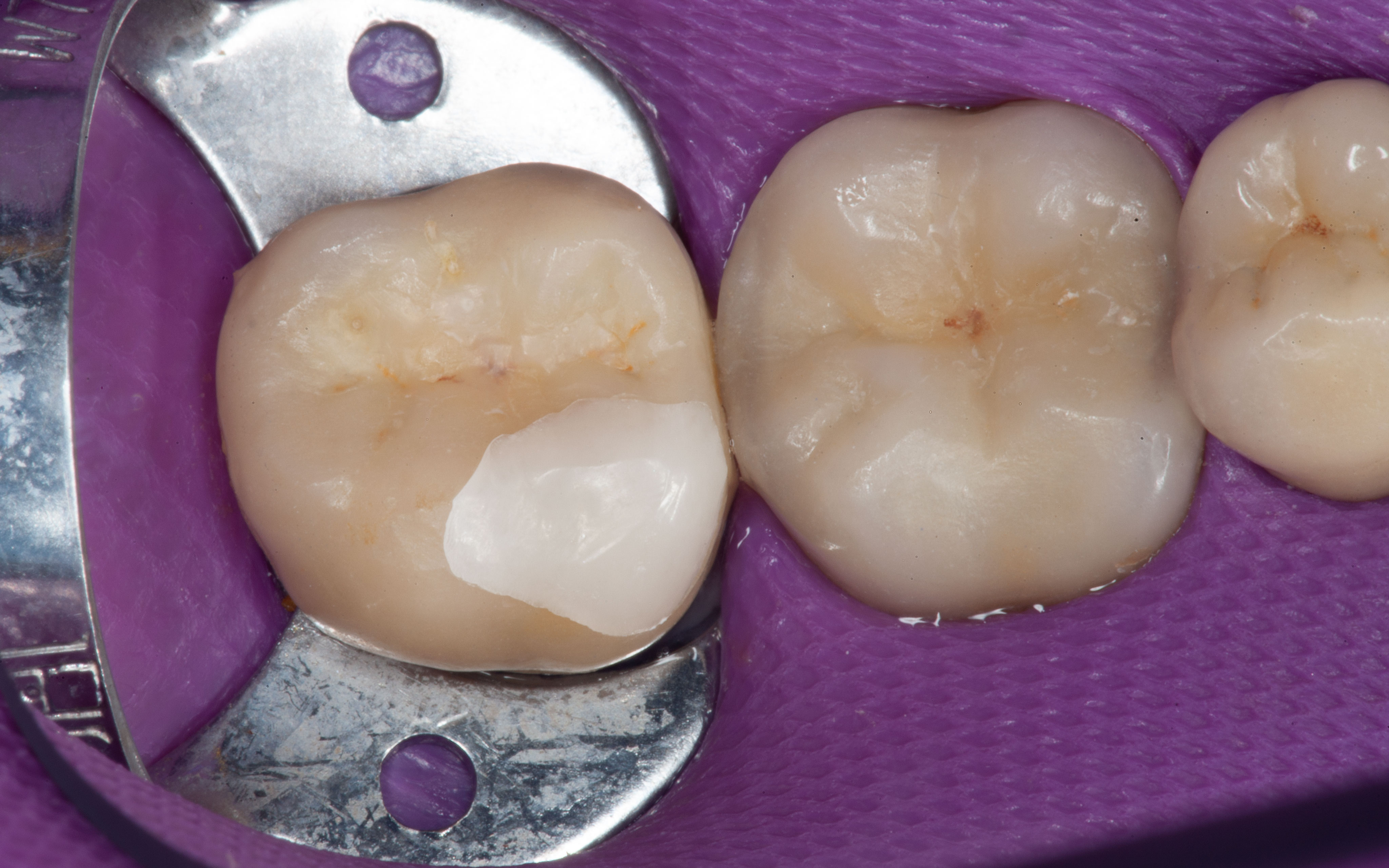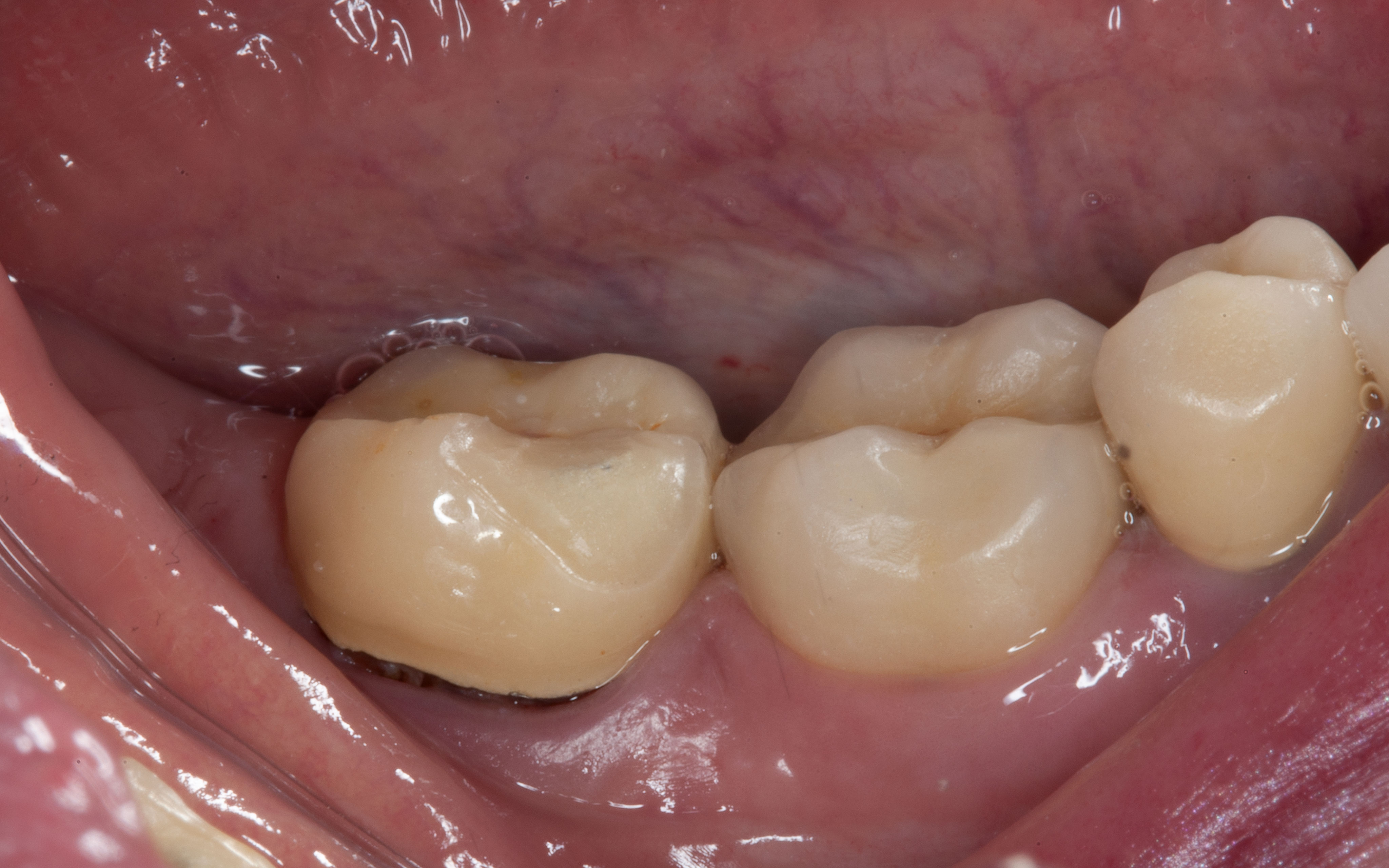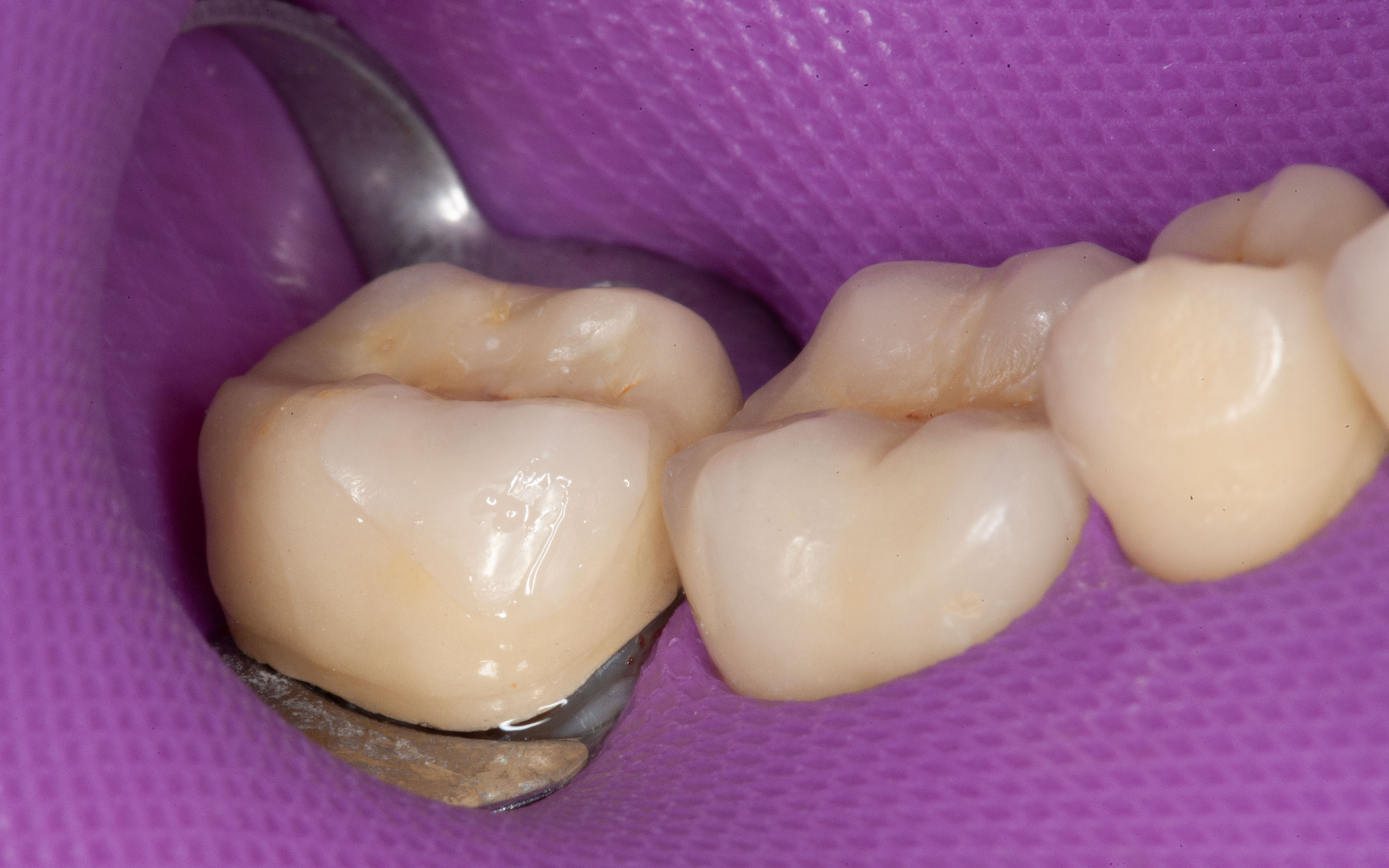 Bei solchen Keramikfrakturen muss immer erst nach der Ursache geforscht werden, damit sie nach der Reparatur lange halten. In diesem Fall war die Eckzahnführung zu schwach. Die Belastung der Krone in Folge zu hoch. Nach Anpassung der Führung konnte das Veneer sicher und stabil platziert werden
