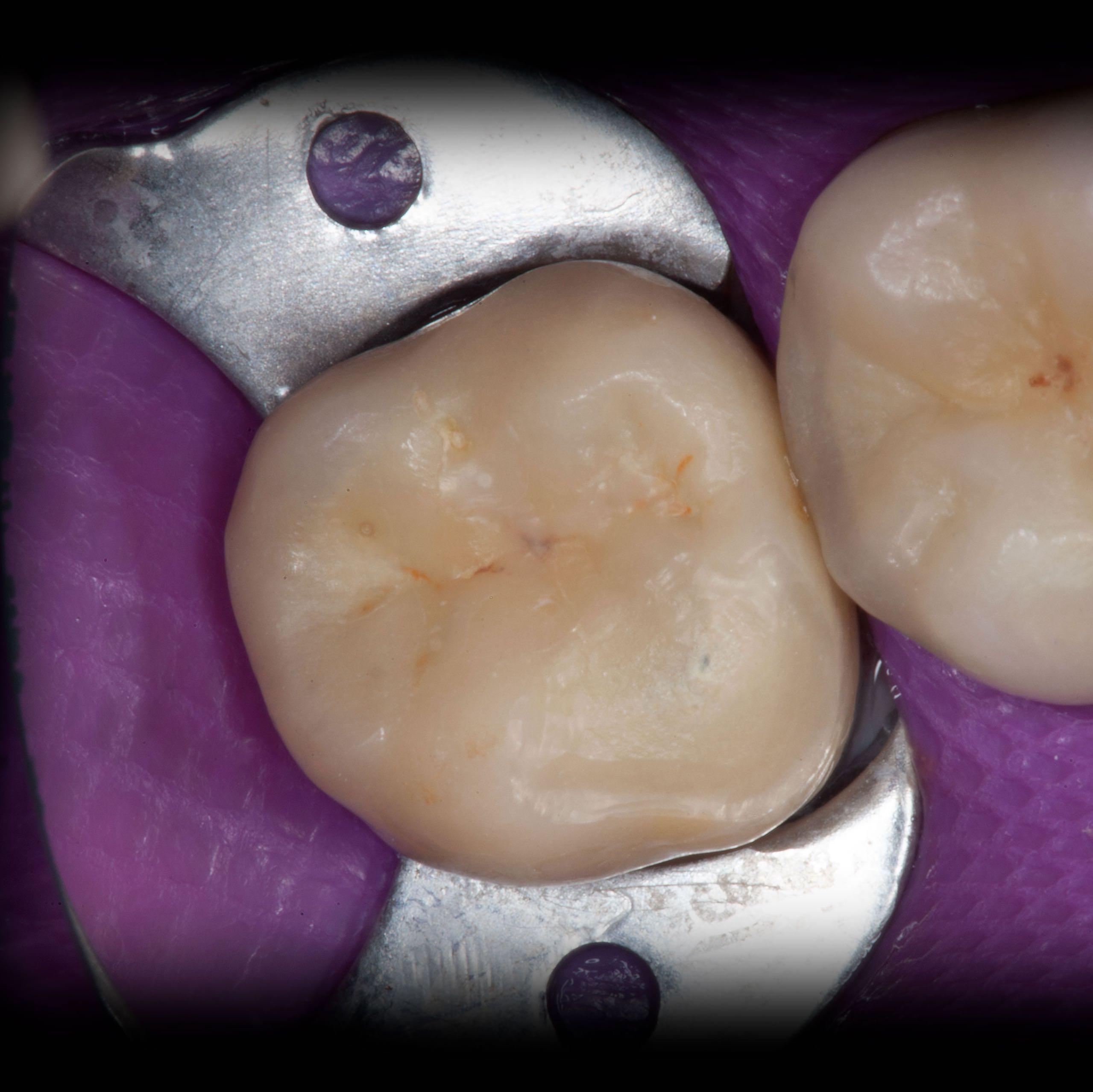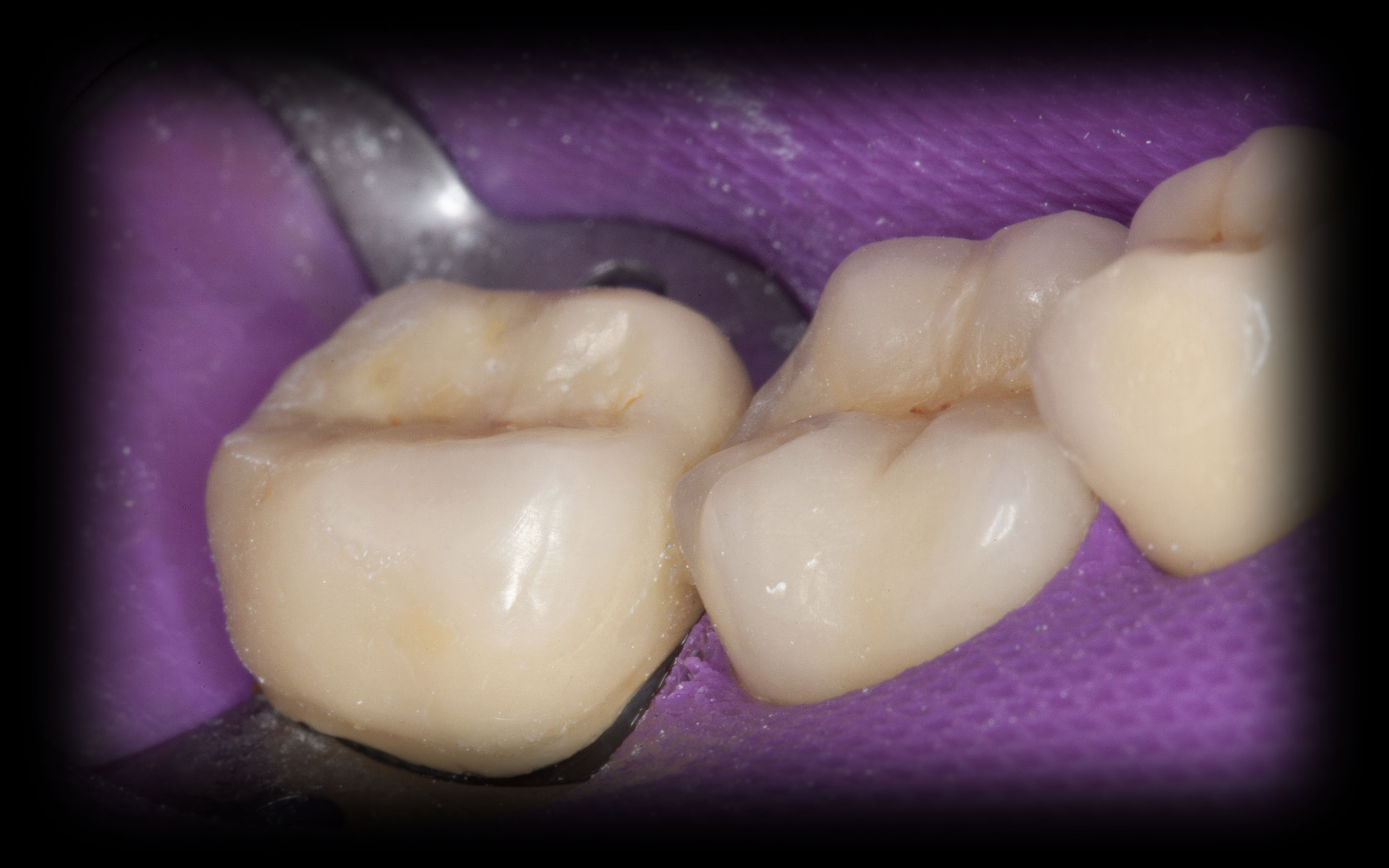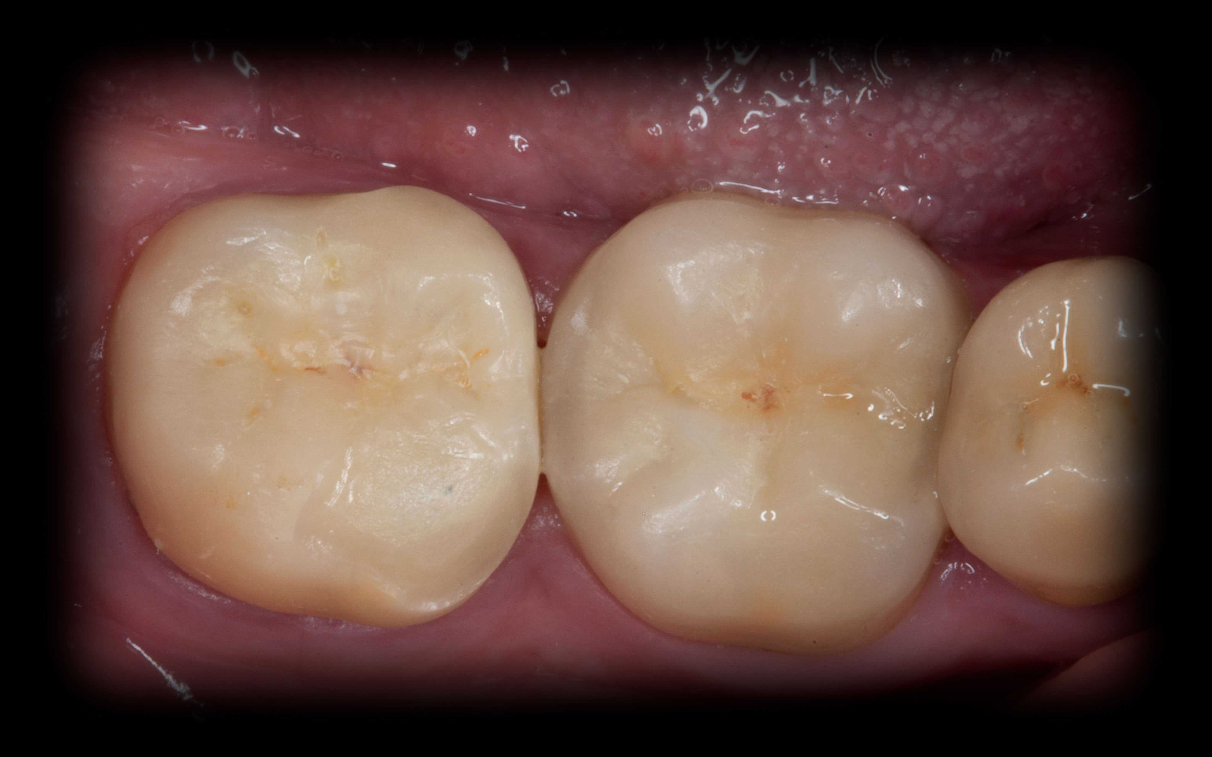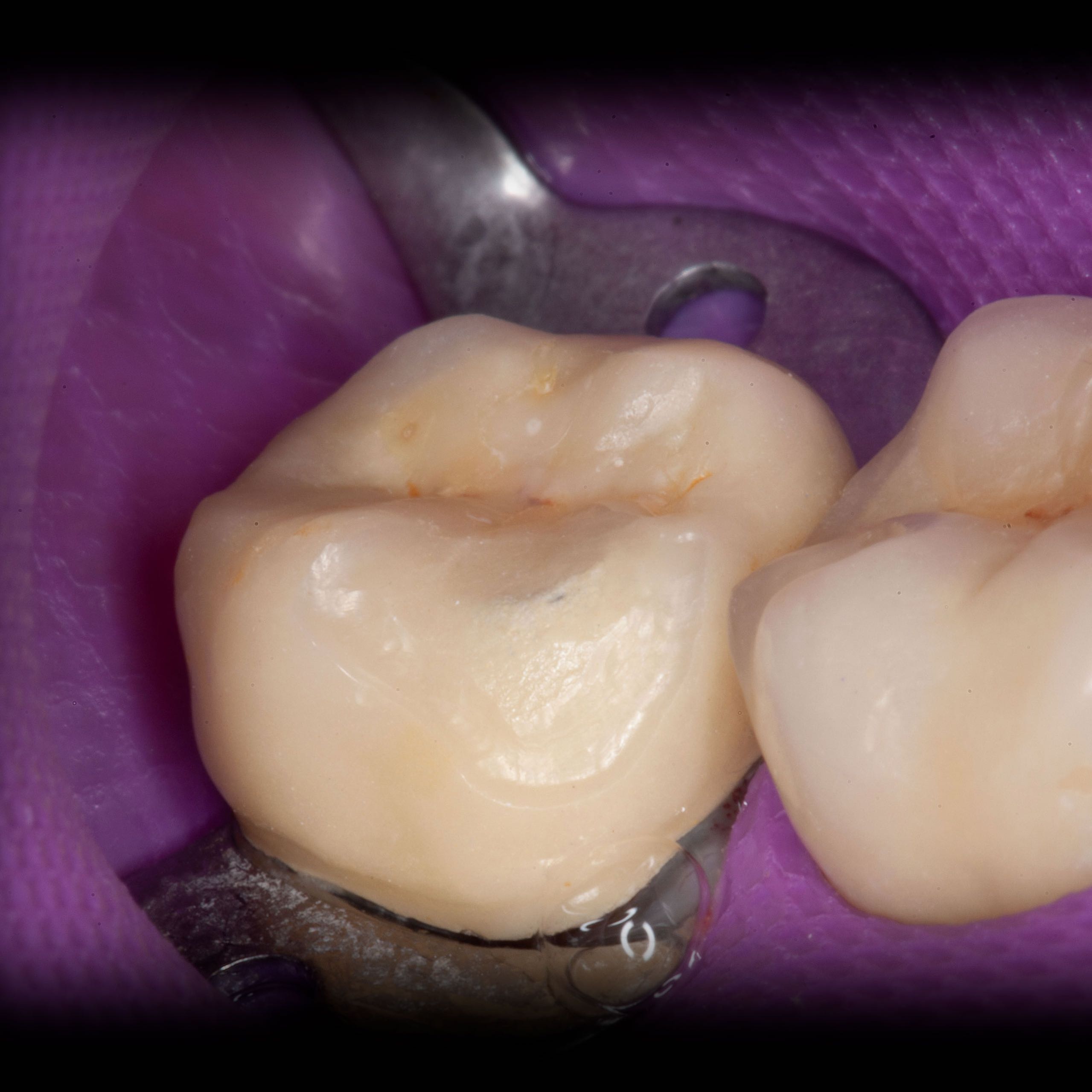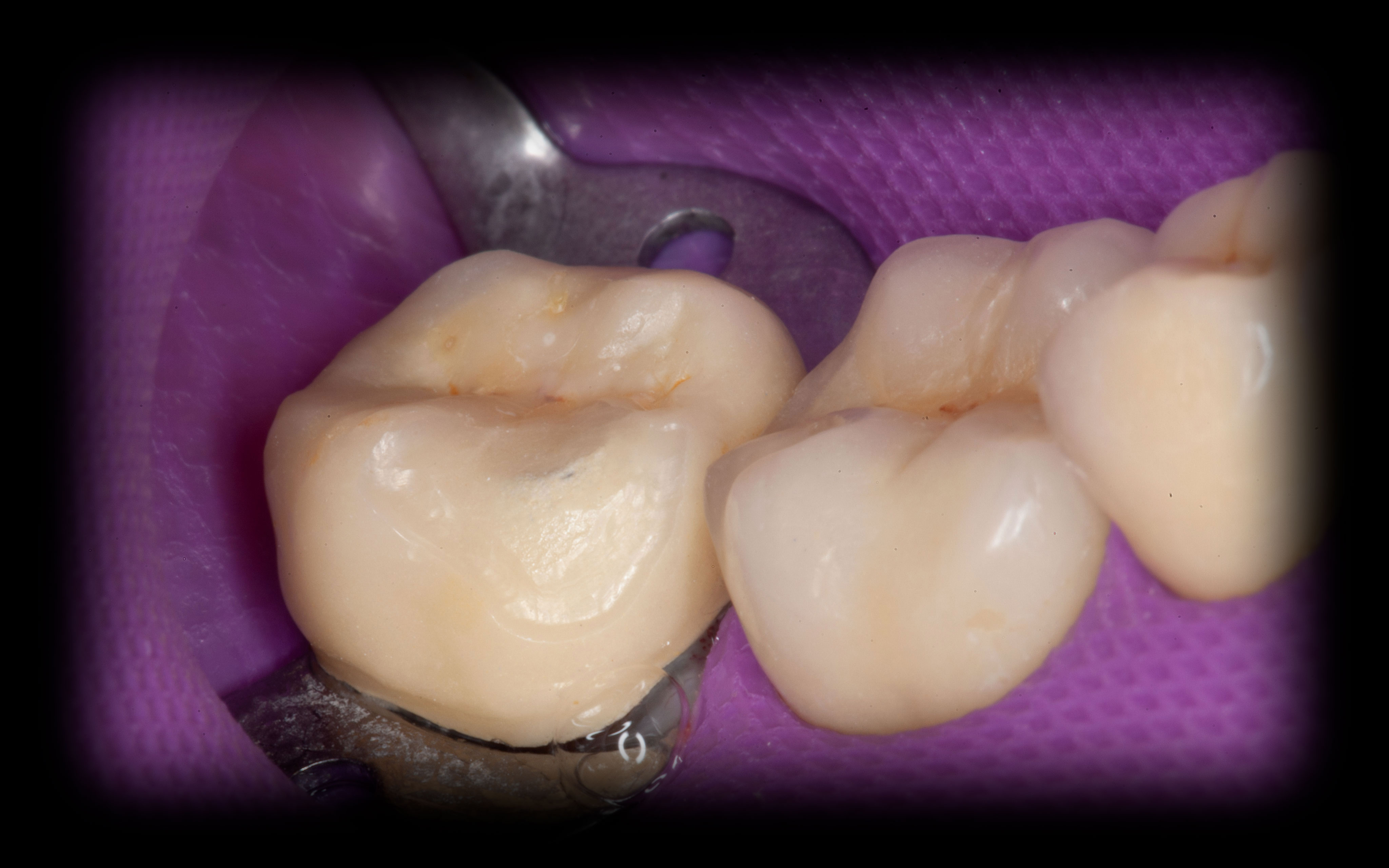 Bei solchen Keramikfrakturen muss immer erst nach der Ursache geforscht werden, damit sie nach der Reparatur lange halten. In diesem Fall war die Eckzahnführung zu schwach. Die Belastung der Krone in Folge zu hoch. Nach Anpassung der Führung konnte das Veneer sicher und stabil platziert werden
