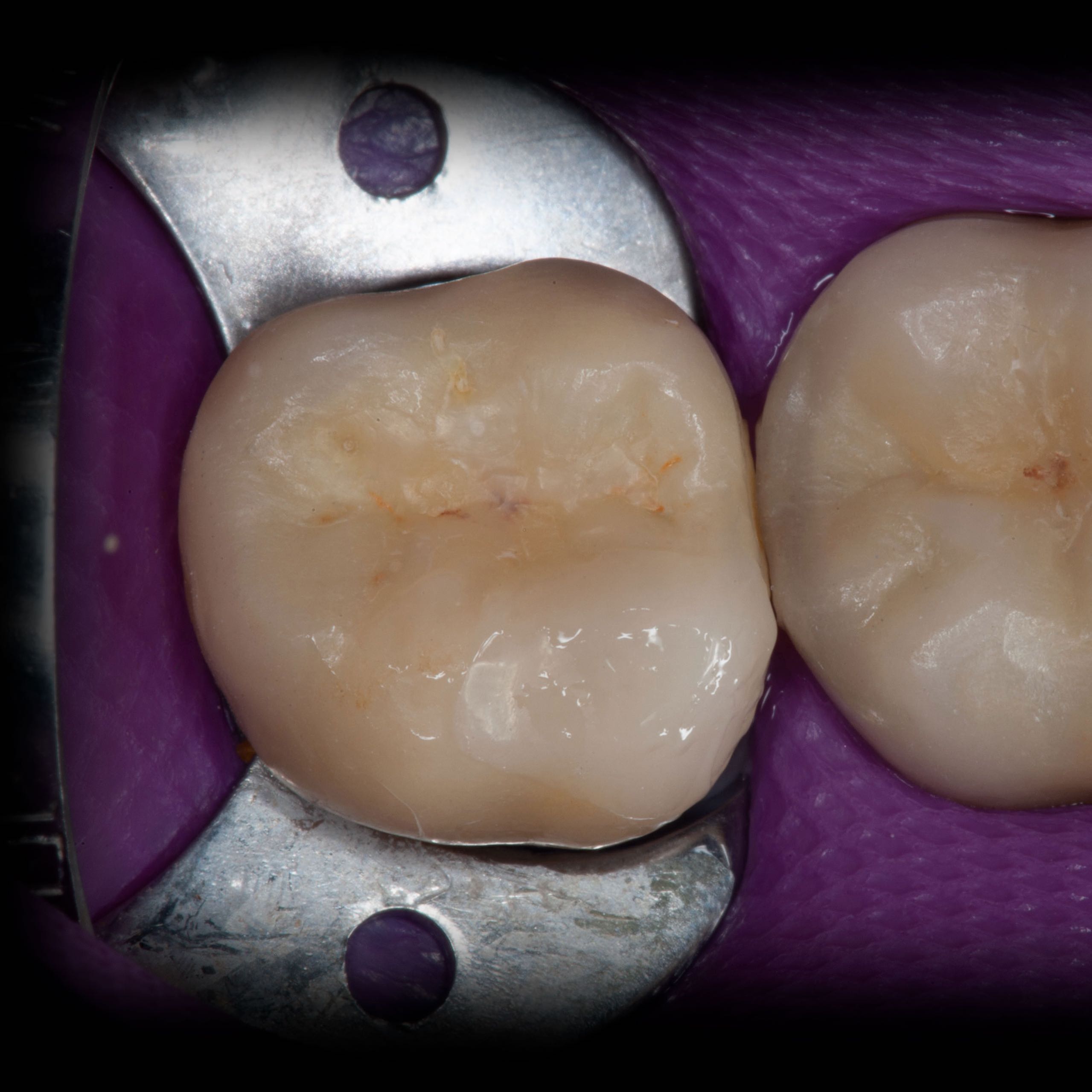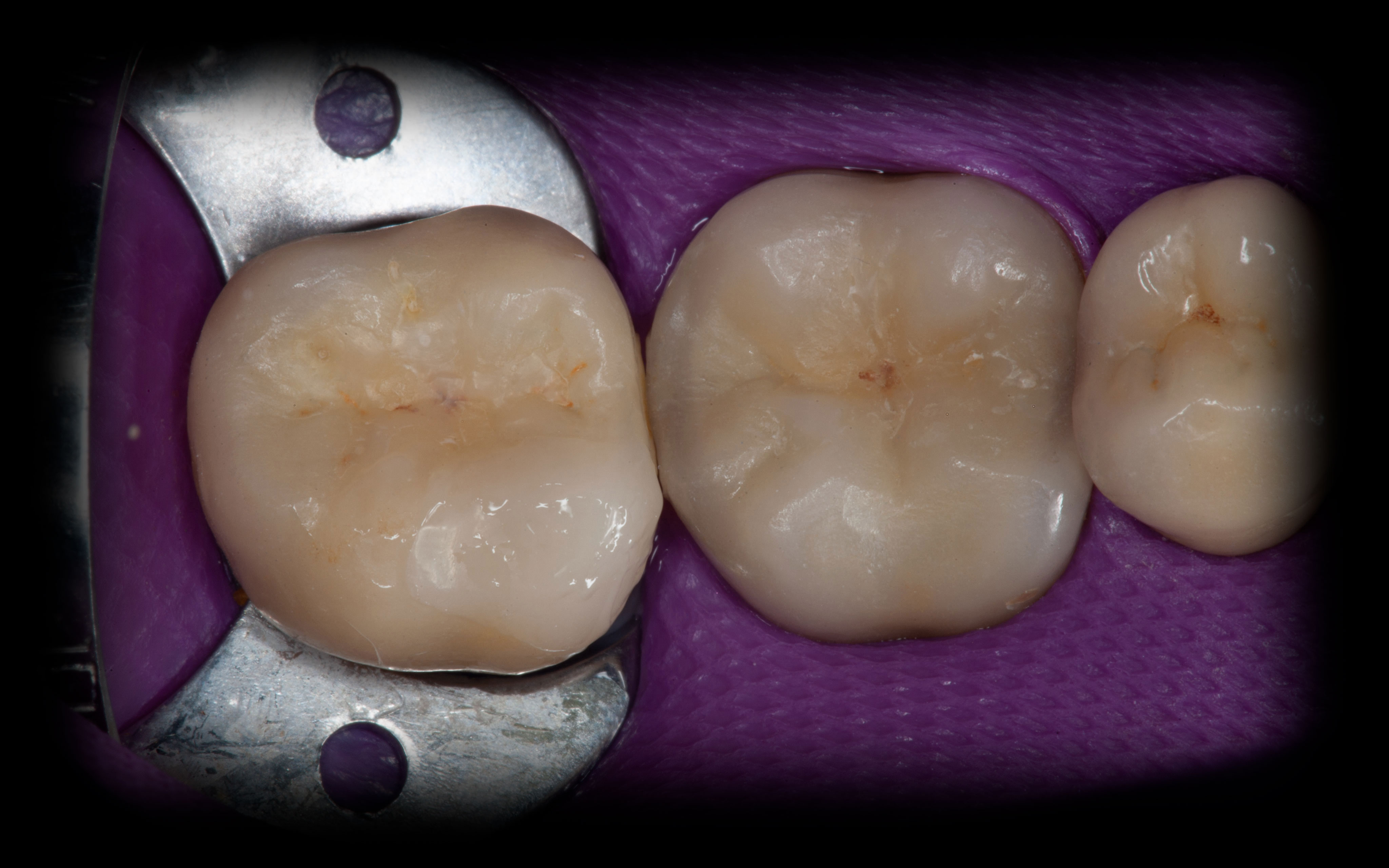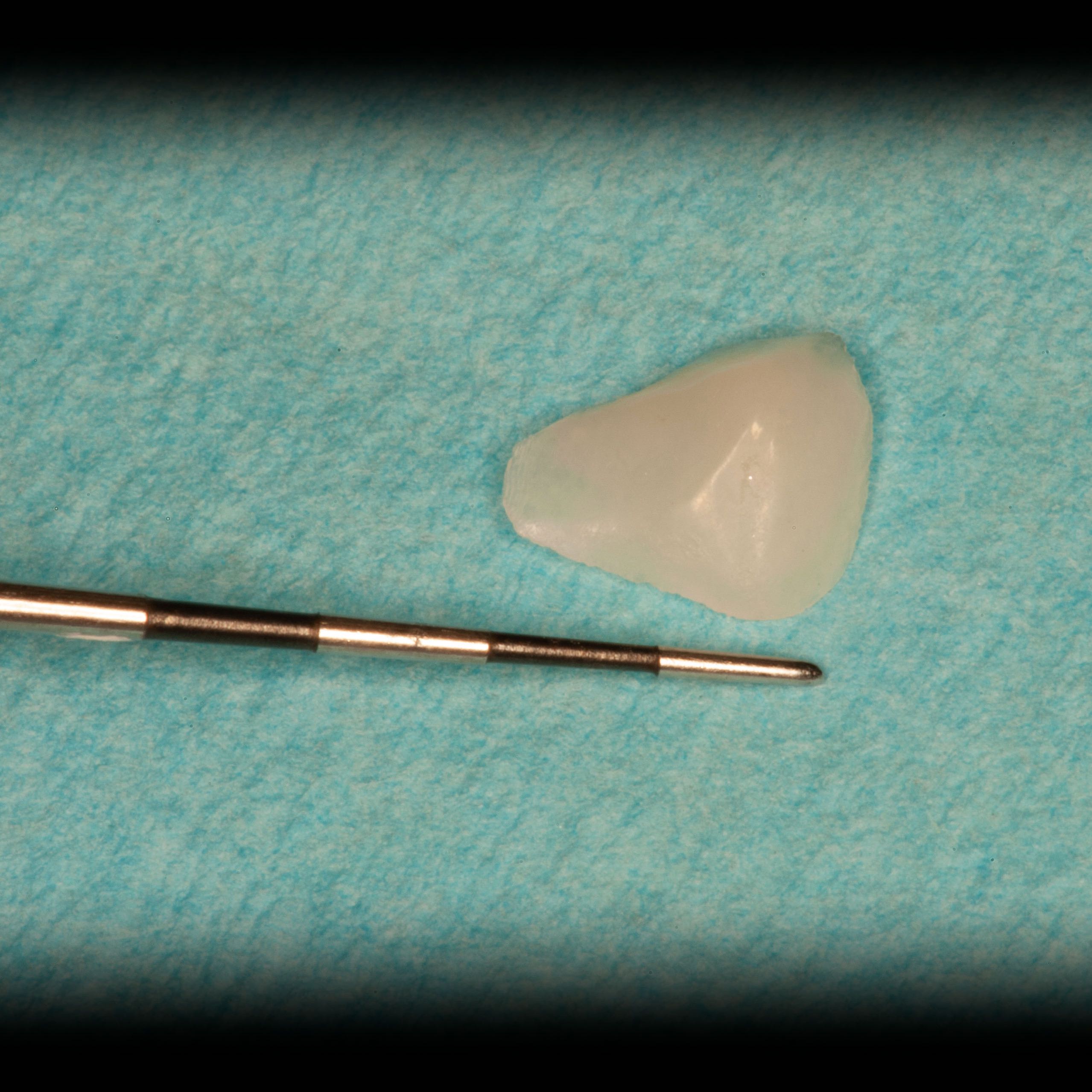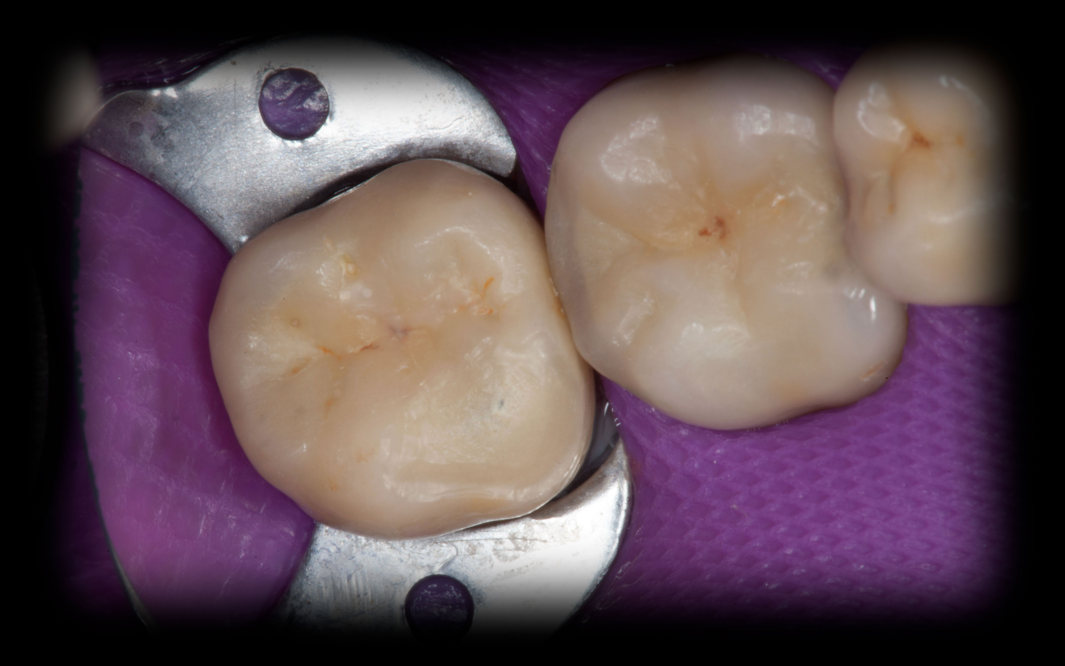 Bei solchen Keramikfrakturen muss immer erst nach der Ursache geforscht werden, damit sie nach der Reparatur lange halten. In diesem Fall war die Eckzahnführung zu schwach. Die Belastung der Krone in Folge zu hoch. Nach Anpassung der Führung konnte das Veneer sicher und stabil platziert werden